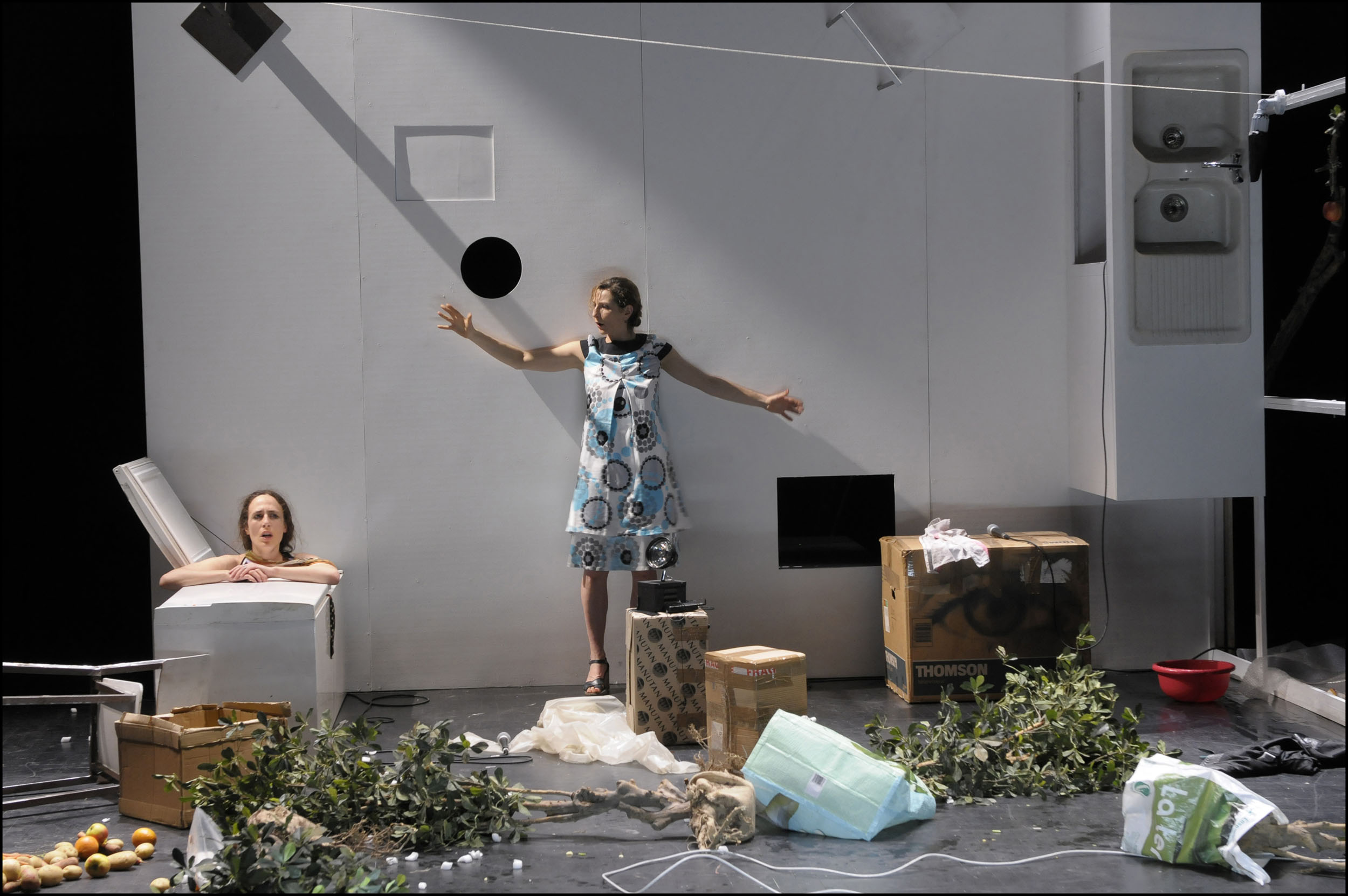 "Deux femmes sur scène, debout, assises, courant, s’arrêtant, en tas, en vrac, en sac, parlent, se parlent, énumèrent, légifèrent, s’interrogent, se demandent, nous demandent, se jugent, se jaugent : mais c’est quoi ? c’est vous, c’est nous, c’est depuis longtemps, c’est ici et maintenant.